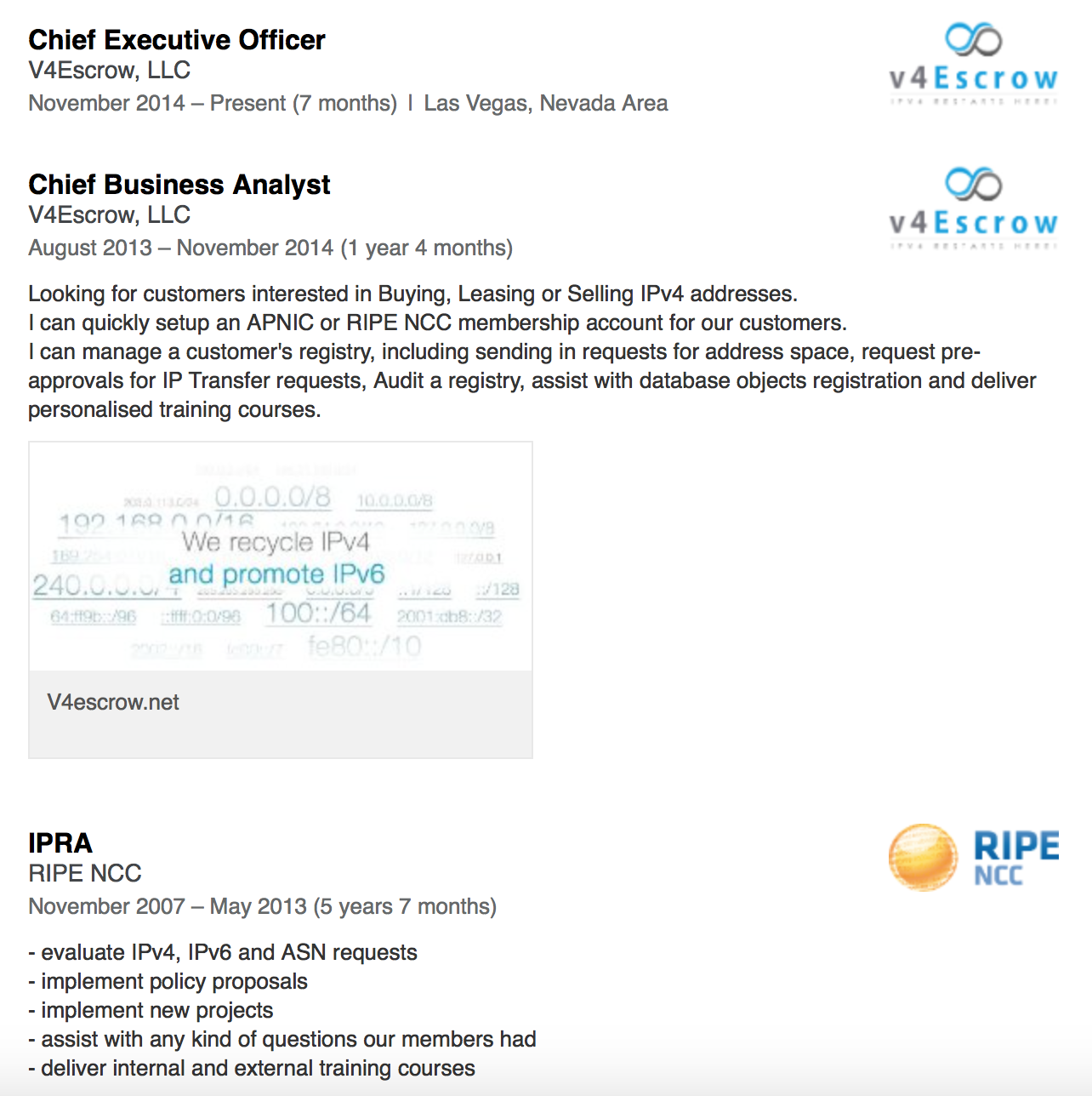 Dear Ciprian, These is are false accusations and I please ask you to stop attacking me personally. As I said, if you or someone else have questions about my activity at RIPE NCC, you should contact me personally or the RIPE NCC directly. I understand that my policy proposal can upset you and other people. My intention is not to propose a policy that will affect your business but to propose something that will benefit the entire community. I also understand that we are competitors in the IP Broker space but in this mailing list I am simply talking as a member of the RIPE community. I believe that defaming competition is not a good practice and this is definitely not the place. Again, I apologize if my policy proposal upsets you and other people and I can assure you that my intention is to propose something that will benefit all of us (the RIPE Community) in the long term. Thank you, Elvis PS: Gert, I know I promised yesterday I will no longer reply back to attacks, but I had to reply to this one and ask Ciprian (one more time) to stop. Can you also do something about it? On 11/06/15 06:43, Callum Stuart wrote: > Hello, > > > One people named WW circulated the following info privately to a large > group of people in ripe region. > > can you swear that there was no conflict of interests ? compared > with the FIFA corruption and collapse, how about we involves the > investigation by FBI or Gov authority? maybe only through this way, > the truth can be disclosed to the PUBLIC. > > > > /Elvis, who used to work in RIPE from Nov, 2007 to May 2013, has > conspired with his countryman and allocated plenty of RIPE IPv4 > blocks to their own registered shell companies without employees. / > > /Elvis established its brokerage company as soon as he resigned from > RIPE and has sold out IPv4 blocks that he had reserved into his > “own account” ( one of the sale was to Saudi Telecommunication and > the sale price is around 7US). This is not just an ethics problem > here and he is committing the CRIME! Ironically, it will so easy to > become rich almost in one night by doing what Elvis has done. How > can RIPE just turn a blind eye on his committed Crime ?/ > > / > / > > > /Elvis has taken the advantage of his role as the IPRA ( he knows > better about what IP values and the policy loopholes than the others > ) and purposely allocated plenty of IPv4 blocks to his own shell for > the speculation. / > > / > / > > /Congrats to Elvis, he has succeeded in becoming a millionaire by > committing crime! Shame on those who do nothing to stop the crime. / > > / > / > > /Cobalt IT (Evolva) same position like Elvis.. at same company.. / > > / > / > > / > / > > /See the evidences including ( company registration info, resources, > linkedin profiles etc) in the attachment. / > > > > > > > > > > > > > > > > > > > > > > > > > > > > > > On Wednesday, June 10, 2015 at 10:56 PM, > address-policy-wg-request at ripe.net wrote: > >> Send address-policy-wg mailing list submissions to >> address-policy-wg at ripe.net <mailto:address-policy-wg at ripe.net> >> >> To subscribe or unsubscribe via the World Wide Web, visit >> https://www.ripe.net/mailman/listinfo/address-policy-wg >> or, via email, send a message with subject or body 'help' to >> address-policy-wg-request at ripe.net >> <mailto:address-policy-wg-request at ripe.net> >> >> You can reach the person managing the list at >> address-policy-wg-owner at ripe.net >> <mailto:address-policy-wg-owner at ripe.net> >> >> When replying, please edit your Subject line so it is more specific >> than "Re: Contents of address-policy-wg digest..." >> >> >> Today's Topics: >> >> 1. Re: RIPE != RIPE NCC (Nick Hilliard) >> 2. Re: Personal attacks - please stop (i ask for the 3rd time) >> (Elvis Daniel Velea) >> 3. Re: Personal attacks - please stop (i ask for the 3rd time) >> (Silvia Hagen) >> 4. Re: Personal attacks - please stop (i ask for the 3rd time) >> (Hannigan, Martin) >> >> >> ---------------------------------------------------------------------- >> >> Message: 1 >> Date: Wed, 10 Jun 2015 15:03:03 +0100 >> From: Nick Hilliard <nick at inex.ie <mailto:nick at inex.ie>> >> To: Randy Bush <randy at psg.com <mailto:randy at psg.com>>, Sascha Luck >> <apwg at c4inet.net <mailto:apwg at c4inet.net>> >> Cc: RIPE address policy WG <address-policy-wg at ripe.net >> <mailto:address-policy-wg at ripe.net>> >> Subject: Re: [address-policy-wg] RIPE != RIPE NCC >> Message-ID: <55784397.1050704 at inex.ie <mailto:55784397.1050704 at inex.ie>> >> Content-Type: text/plain; charset=windows-1252 >> >> On 10/06/2015 14:03, Randy Bush wrote: >>> what is missing here is that, if only LIRs decided policy, a few >>> thousand folk (likely 10 people on a mailing list), would decide policy >>> affecting millions internet users. >> >> ~980m. >> >> Nick >> >> >> >> >> ------------------------------ >> >> Message: 2 >> Date: Wed, 10 Jun 2015 17:16:19 +0300 >> From: Elvis Daniel Velea <elvis at velea.eu <mailto:elvis at velea.eu>> >> To: address-policy-wg at ripe.net <mailto:address-policy-wg at ripe.net> >> Subject: Re: [address-policy-wg] Personal attacks - please stop (i ask >> for the 3rd time) >> Message-ID: <557846B3.1010009 at velea.eu >> <mailto:557846B3.1010009 at velea.eu>> >> Content-Type: text/plain; charset=utf-8; format=flowed >> >> Hi Ciprian, >> >> > so not that the policy is useless but it's proposal was a mistake. >> >> Calling my proposal a mistake is very rude from you and I already asked >> you to stop being rude, before you started the thread below. >> >> Even though I already responded to a message you have sent yesterday >> telling you that it's not nice what you are doing, you have continued to >> make false accusations and wrongfully interpret what others have said. >> Curious though, all the wrong interpretations were just to start attacks >> against me... >> >> On 10/06/15 14:39, Ciprian Nica wrote: >>> Hi, >> [...] >>>> Please provide evidence for following claim, otherwise you