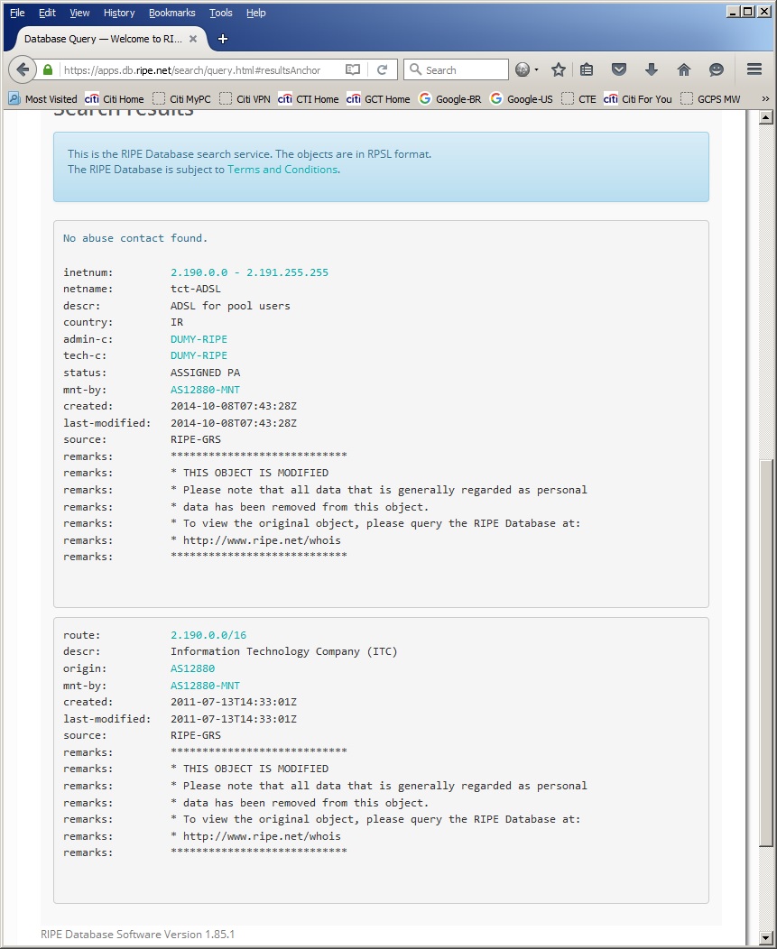 Hi. I am using the following FTP files to identify IPs per Country: ftp://ftp.arin.net/pub/stats/arin/delegated-arin-extended-latest ftp://ftp.afrinic.net/pub/stats/afrinic/delegated-afrinic-latest ftp://ftp.apnic.net/pub/stats/apnic/delegated-apnic-latest ftp://ftp.lacnic.net/pub/stats/lacnic/delegated-lacnic-latest ftp://ftp.ripe.net/ripe/stats/delegated-ripencc-latest ftp://ftp.apnic.net/pub/stats/iana/delegated-iana-latest While doing some searchs on the web, I found a few IP Addresses that are not included in those files, for example, 2.190.0.0 however, when i searched on the Web Database (see attached screenshot), it was found as an IRAN subnet and assigned by RIPENCC. Why I am unable to see this subnet in the files? Am I doing the download of the incorrect files? Can someone please help me to identify whats the best process to get the correct list of IPs/subnets per country? -- Best Regards, Ricardo Cukier -------------- next part -------------- An HTML attachment was scrubbed... URL: </ripe/mail/archives/db-wg/attachments/20160211/0e9ba776/attachment.html> -------------- next part -------------- A non-text attachment was scrubbed... Name: Query.jpg Type: image/jpeg Size: 199773 bytes Desc: not available URL: </ripe/mail/archives/db-wg/attachments/20160211/0e9ba776/attachment.jpg>