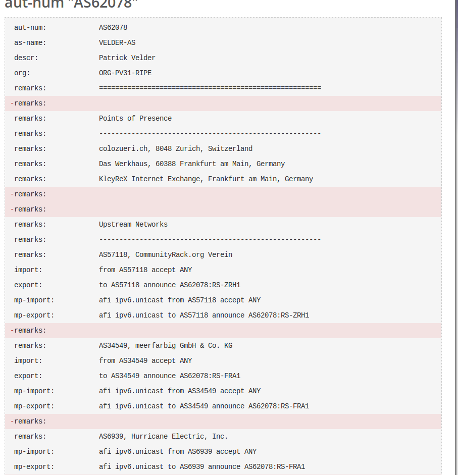 Hello Alex Thanks for bringing back the single text field editor. Unfortunately it deletes all empty "remarks:" lines. I use them to separate blocks in my objects. Please fix that. Thanks and best regards Patrick On 20.01.2016 20:29, Alex Band wrote: > Dear colleagues, > > As promised, we have been working hard on bringing back updates in a single text area. This functionality is now available for creating and modifying objects. > > In webupdates, you will find a button in the top right corner to switch back and forth between "text area" and "single lines", allowing you to choose your preferred update method before making changes. A new feature is that your preference is saved for the next time you visit. > > https://alexband.nl/temp/textupdates.png > > In addition, we added we added Force Delete to webupdates, which you can select from the authentication dialog box when modifying an existing object. This functionality—which was previously known as "reclaim"—allows you to delete inet(6)num, domain and route(6) objects using the maintainer of a covering address space object, instead of the maintainer of the object itself. This is useful in cases where you don't have control over an object, and it is blocking you from creating a new one. > > When choosing Force Delete, we retrieve all of the maintainers that can be used to remove the selected object. Simply select a maintainer you can use to authenticate and you're done. > > https://alexband.nl/temp/force-delete.png > > Lastly, with your feedback and by analysing how the new design is being used, we included lots of small improvements to make your life a little easier. > > If you have any comments or something isn't working quite right, please do not hesitate to use the Feedback button on the RIPE Database pages to send us a screenshot with your annotations. > > Kind regards, > > Alex Band > Product Manager > RIPE NCC > > > >> On 1 Dec 2015, at 12:27, Alex Band <alexb at ripe.net> wrote: >> >> Hello everyone, >> >> We're happy that there is such an active discussion on RIPE Database functionality. >> >> In my previous message we said we would implement updating the RIPE Database in a single text area if there would be enough demand. It is very clear this is something that many of you want back as soon as possible. :) >> >> As promised, we will work on making an elegant solution to achieve this. The current workaround is to copy and paste the object you queried into "Syncupdates" and go from there: >> >> https://apps.db.ripe.net/syncupdates/simple-rpsl.html >> >> This update method will allow you to use your SSO account to authenticate as well, if it is associated with your maintainer. >> >> We would like to remind you that all changes and new functionality that is created for the RIPE Database is deployed to the Release Candidate environment first. This way you can test and provide feedback several weeks before it is deployed to production, allowing us to adjust course if needed. >> >> https://www.ripe.net/manage-ips-and-asns/db/release-notes/rc-release-candidate-environment >> >> Please subscribe to the Database Working Group mailing list to participate in functionality discussions and stay up to date on new releases. >> >> https://www.ripe.net/participate/ripe/wg/db >> >> Kind regards, >> >> Alex Band >> Product Manager >> RIPE NCC >> >> >>> On 30 Nov 2015, at 18:50, Erik Bais - A2B Internet <ebais at a2b-internet.com> wrote: >>> >>> Hi Alex, >>> >>> The change where the single text field was depreciated into a 2 step, is creating additional work / window switching. >>> >>> Especially since you need to copy and paste the current info from another window into a second screen, paste/edit the info, update the object. >>> >>> Is there an option where this is going to be reverted back as it was, as it was actually used ... >>> >>> Especially being able to search an object and being able to select it to change it in a single text field.. Instead of having to cut and paste. ( yes we are lazy and yes that is what you get if you try to automate as much as possible ;-) ) >>> >>> Regards, >>> Erik Bais >>> >>> >>>> Op 25 nov. 2015 om 12:07 heeft Alex Band <alexb at ripe.net> het volgende geschreven: >>>> >>>> Hello everyone, >>>> >>>> I would just like to clarify a couple of things on the redesigned user interface, based on the feedback we have received so far. >>>> >>>> First of all, these are the URLs to all of the different parts of the RIPE Database web ui, as it seems some people are getting a bit lost: >>>> >>>> Query: https://apps.db.ripe.net/search/query.html >>>> Create using single text field: https://apps.db.ripe.net/db-web-ui/ >>>> Create/Update using multiline text area: https://apps.db.ripe.net/syncupdates/simple-rpsl.html >>>> >>>> In addition, the TEST database user interface now has its own dedicated URL, instead of having to select it with a radio button: >>>> >>>> https://apps-test.db.ripe.net/ >>>> >>>> The option to edit an existing object in a single text area is functionality that was used very infrequently according to our statistics. We decided to leave it out of the first phase of the redesign, as most people use email or scripting to update the RIPE Database in a single text area. If there is a lot of demand, we'll implement that option as well for the web interface as well. >>>> >>>> Please keep in mind that it not impossible to edit an existing object in a single text area, it is simply a two-step process. You can copy and paste the object you queried into Syncupdates and go from there. This update method will allow you to use your SSO account to authenticate as well, if it is associated with your maintainer. >>>> >>>> Lastly, I realise "Syncupdates" is not the most descriptive name ever. We will make sure that we have a look at the wording of the different menu items to avoid confusion. >>>> >>>> Kind regards, >>>> >>>> Alex Band >>>> Product Manager >>>> RIPE NCC >>>> >>>>> On 25 Nov 2015, at 11:28, Andy Betts <A.