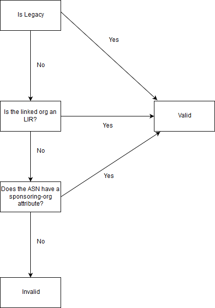 Hi Wilfried, Well it does have an org attribute but the organization that is specified is of type "OTHER" and since the ASN is not legacy it would need a sponsoring-org attribute if the organization was of type "OTHER". I have attached a flowchart to help visualize it, I may be wrong but from my understanding, this is how it is. Kind regards, Cynthia Revström On 2019-01-07 14:47, Wilfried Wöber wrote: > Hm, I am a tad puzzled, because AS200358 *does* have an org: reference, > although it claims to be a "Registrar" (BoltN Hosting Limited (Registrar Services)). > > So I would assume that AS200358 is a sponsored AS#? > > As I am not aware that we use the "Registrar" term or model in the IP registry, > I tried to follow up on the org-type: OTHER by an attempt to get a listing of the > possible values for org-type: by using the template flag of whois. > > Unfortunately, neither the short format -t nor the --template syntax is accepted > by the whois web interface. "ERROR:111: invalid option supplied" > > So, the primary Q is: which values are accepted or used in the org-type: attribute? > > Secondly, are there other flags which cannot be used in the web interface (and why?) > > All the best for a smooth start into ++(2018), > best regards, > Wilfried > > On 07/01/2019 11:38, Cynthia Revström via db-wg wrote: >> Just realized I made a mistake while writing the last message, ASNs without sponsoring-org attribute and without LEGACY status, and ORG that is of type other are unsponsored. >> >> Kind regards, >> Cynthia Revström >> >> On 2019-01-07 11:34, Cynthia Revström via db-wg wrote: >>> Just an update: Laurens Hoogendoorn from the NCC contacted me and did indeed confirm that ASNs without LEGACY status with an ORG that is OTHER are indeed unsponsored, and that you can look at stat.ripe.net historical whois to find out for how long. >>> >>> I do still think that it should be more obvious than this. >>> >>> Kind regards, >>> Cynthia Revström >>> >>> On 2019-01-07 10:57, Cynthia Revström via db-wg wrote: >>>> So I have now run across several ASNs in which the org is of type "OTHER" yet there is no sponsoring-org, could this please be clarified? >>>> >>>> Example ASNs: AS200358, AS204842 >>>> >>>> If it is like I think it is, it must be that they have lost their sponsors but if that is the case, I would like to see a remark that is an "RIPE NCC managed value" saying something like "This ASN does not have any sponsor since YYYY-MM-DD". >>>> >>>> I am not entirely sure on this but something to clarify what is going on. >>>> >>>> Kind regards, >>>> Cynthia Revström >>>> >>>> -------------- next part -------------- A non-text attachment was scrubbed... Name: ripe_asn.png Type: image/png Size: 13559 bytes Desc: not available URL: </ripe/mail/archives/db-wg/attachments/20190107/506e5aac/attachment.png>