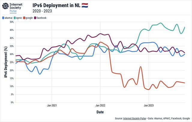 In case we believe Google and/or Geoff stats are wrong I believe it's a good idea to check other sources. Facebook offers a per country IPv6 stats (https://www.facebook.com/ipv6/?tab=ipv6_country) For the Netherlands: Alejandro, On 10/10/23 11:16 AM, Olivier MJ Crépin-Leblond wrote: > No noticeable change on content supplier side: > https://ipv6matrix.org/hosts/country-NL > > Kindest regards, > > Olivier > > > On 10/10/2023 11:26, Mat Ford via ipv6-wg wrote: >> Pick your outlier: >> >> 5abe11939cb84340.jpeg >> IPv6 Deployment in NL >> <https://public.flourish.studio/visualisation/15305298/> >> public.flourish.studio >> <https://public.flourish.studio/visualisation/15305298/> >> >> <https://public.flourish.studio/visualisation/15305298/> >> >> >>> On 10 Oct 2023, at 10:26, Marco Davids (Private) via ipv6-wg >>> <ipv6-wg at ripe.net> wrote: >>> >>> Hello, >>> >>> Is there anyone in this group that would dare to speculate on the >>> sudden drop in IPv6 adoption for my country, the Netherlands on this >>> URL? >>> >>> https://www.google.com/intl/en/ipv6/statistics.html#tab=per-country-ipv6-adoption >>> >>> The drop is best shown here: >>> >>> https://www.vyncke.org/ipv6status/project.php >>> >>> >>> -- >>> Marco >>> >>> -- >>> >>> To unsubscribe from this mailing list, get a password reminder, or >>> change your subscription options, please visit: >>> https://mailman.ripe.net/ >> >> >> > -------------- next part -------------- An HTML attachment was scrubbed... URL: </ripe/mail/archives/ipv6-wg/attachments/20231010/2c4abee5/attachment.html> -------------- next part -------------- A non-text attachment was scrubbed... Name: hjtobqvybsTnt0OH.png Type: image/png Size: 175053 bytes Desc: not available URL: </ripe/mail/archives/ipv6-wg/attachments/20231010/2c4abee5/attachment.png> -------------- next part -------------- A non-text attachment was scrubbed... Name: 5abe11939cb84340.jpeg Type: image/jpeg Size: 52281 bytes Desc: not available URL: </ripe/mail/archives/ipv6-wg/attachments/20231010/2c4abee5/attachment.jpeg>