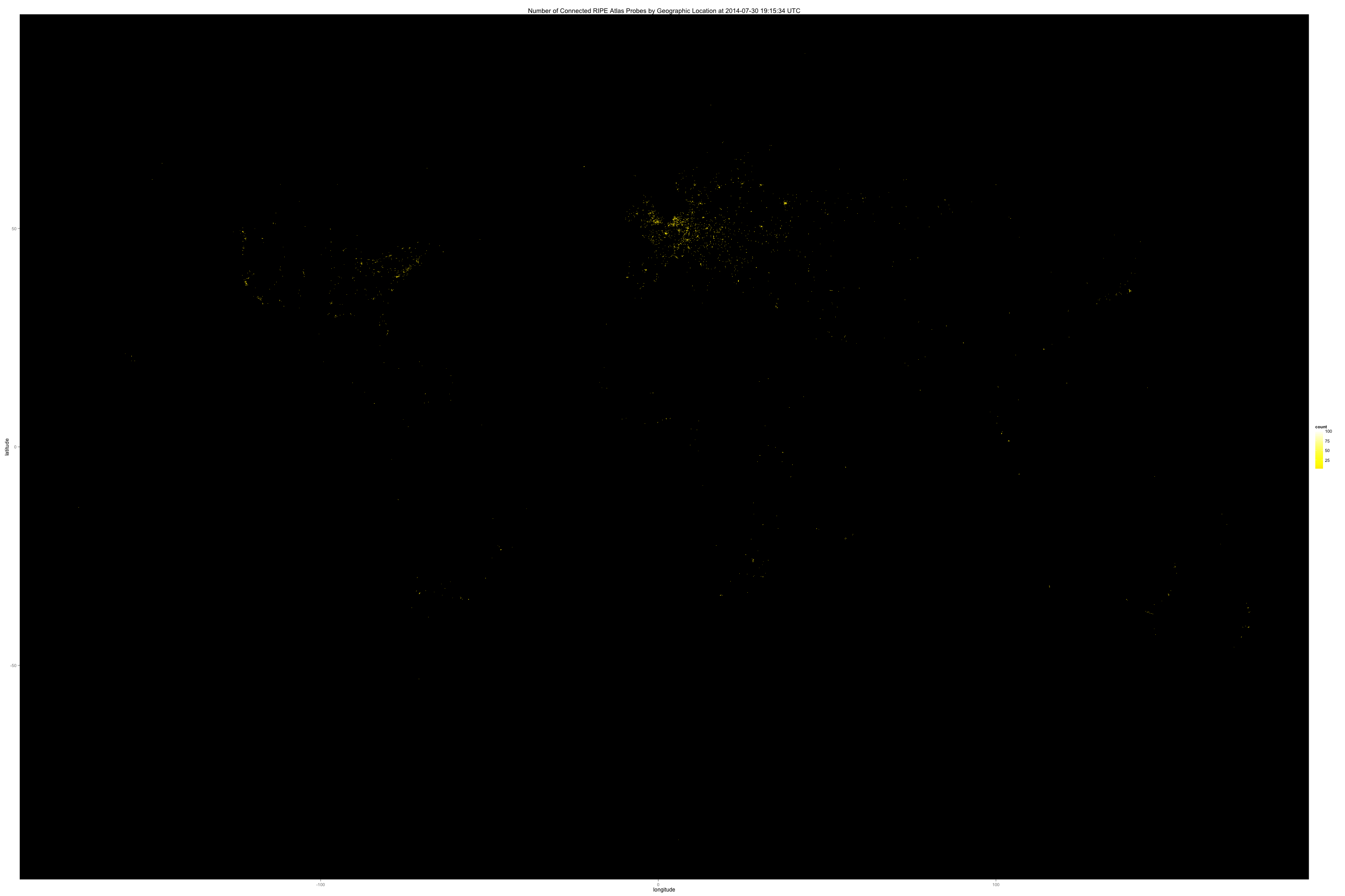 In the meeting George Michaelson referred to the light maps from space that were part of the the inspiration for RIPE Atlas as shown in http://www.slideshare.net/ripencc/ripe-atlas-a-real-big-measurement-network-7120708 Attached is a map of the RIPE Atlas probes in a similar colour scheme which I did a couple of months ago. It is large, you can zoom in. I leave it to your judgement how similar these are. Personally I am amazed how how well one can see things around Europe. Daniel -------------- next part -------------- A non-text attachment was scrubbed... Name: connected-2.png Type: image/png Size: 153395 bytes Desc: not available URL: </ripe/mail/archives/mat-wg/attachments/20141105/ba6a9b5e/attachment.png>
