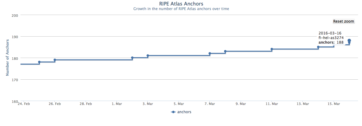 Dear colleagues, 11 new RIPE Atlas anchors have been activated during the last month, bringing the total number to 188: - uk-lba-as33920, hosted by aql in Leeds, United Kingdom - de-ber-as62310, hosted by managedhosting.de GmbH in Berlin, Germany - bt-thi-as38740, hosted by Tashi InfoComm Limited in Thimpbu, Bhutan and sponsored by APNIC - cz-prg-as52130, hosted by Livesport s.r.o. in Prague, Czech Republic - de-dar-as8365, hosted by TU Darmstadt - Secure Mobile Networking Lab / DFG Collaborative Research Center in Darmstadt, Germany - one more anchor hosted by INX-ZA/Internet Service Providers' Association of South Africa: za-cpt-as37663 in Cape Town, South Africa - ee-tll-as51349, by Estonian Internet Foundation in Tallinn, Estonia - two anchors hosted by Sky UK Limited: uk-lon-as5607 in London and uk-slo-as5607 in Slough, United Kingdom - sixth anchor for Leaseweb Network B.V.: hk-hkg-as133752 in Hong Kong - fi-hel-as3274, hosted by Cygate Oy in Helsinki, Finland. The map of all anchor locations is available at: https://atlas.ripe.net/anchors/map/ You can access the anchoring measurements for all anchors at: https://atlas.ripe.net/anchors/list/ And here are the logos and links to hosting companies: https://atlas.ripe.net/get-involved/community/#!tab-anchor-sponsors We are still accepting new applications from organisations interested in hosting a RIPE Atlas anchor. We are particularly interested in deploying anchors in the Middle East, Western Asia, Latin America and Africa, in order to add more geographical diversity to the measurement data. There are more organisations that want to host a RIPE Atlas anchor but don’t have the necessary funding. To learn more about sponsoring an anchor, please contact us at mcb at ripe.net To apply for your own RIPE Atlas anchor: https://atlas.ripe.net/get-involved/become-an-anchor-host/ For any other questions, please contact us at atlas at ripe.net Regards, Vesna Manojlovic Measurements Community Building RIPE NCC -------------- next part -------------- A non-text attachment was scrubbed... Name: anchors 177-188.png Type: image/png Size: 44678 bytes Desc: not available URL: </ripe/mail/archives/mat-wg/attachments/20160318/110be57f/attachment.png>