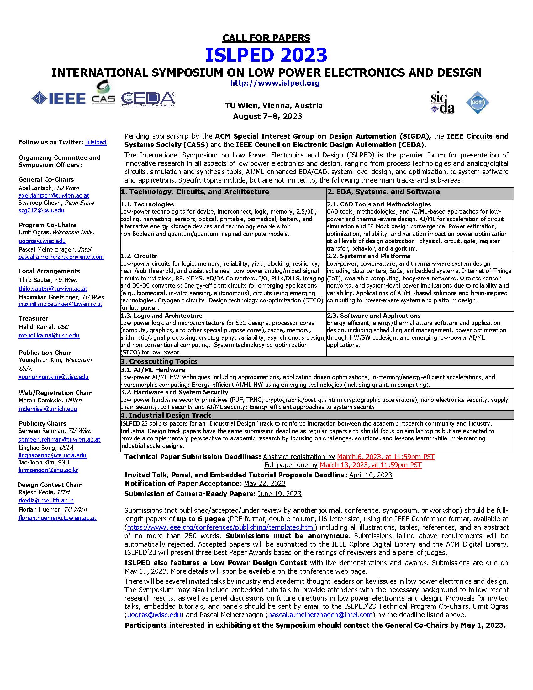 [cid:a9d6f7f9-e895-4951-a2d9-886946600a46] Thank you, Semeen Rehman ISLPED 2023 Publicity co-chair ====== Assist. Prof. Univ. Doz. Dr.-Ing. Semeen Rehman Institute of Computer Technology (ICT), Faculty of Electrical Engineering Vienna University of Technology (TU Wien) -------------- next part -------------- An HTML attachment was scrubbed... URL: </ripe/mail/archives/raci-list/attachments/20221223/5fc5ad35/attachment-0001.html> -------------- next part -------------- A non-text attachment was scrubbed... Name: ISLPED2023_CFP.jpg Type: image/jpeg Size: 650626 bytes Desc: ISLPED2023_CFP.jpg URL: </ripe/mail/archives/raci-list/attachments/20221223/5fc5ad35/attachment-0001.jpg>