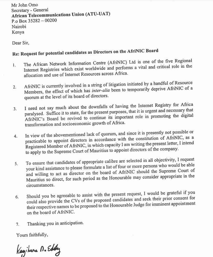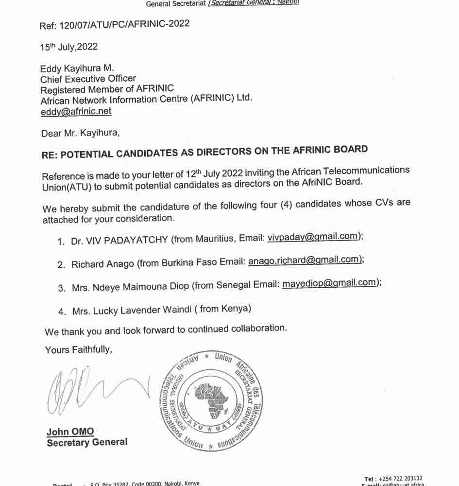 Dear Global community I have very unfortunate news to share with you. The suspended CEO of AFRINIC, Eddy Kayihura - has written to African Telecommunication union, an Inter-government body and requested them to appoint the directors of AFRINIC. This is a clear attempt to avoid the legitimate election by depriving AFRINIC members' right to select their own directors. According to ATU's reply, they have proposed four directors. One of them is involved in fraud proceedings. https://www.lawandpowerkenya.com/interconsult-engineers-ltd-director-six-others-charged-with-fraud/ The RIR community has been running on the principle of community-drive bottom up process for years. This is the foundation of today's Internet. By adhering to this principle, the RIRs have successfully resisted external interference from governmental bodies such as ITU. It is extremely regretful to see that a suspended CEO of one of the RIRs, is trying to ask a governmental body to interfere with RIR's independent procedure. This is putting the entire system at a tremendous risk that we have never had before. The suspended CEO is continually trying to take further legal action in secret. He is spending members money on this. We were lucky to retrieve this letter, from the case Eddy filed against AFRINIC, in an attempt to appoint four directors suggested by ATU as elected directors, in which in that affidavit in the case, Eddy admitted that AFRINIC is lacking of quorum and can not defend its own case, so Eddy is trying to use this opportunities to bypass the very election allows member to have their voice heard. The suspended CEO is acting without authority and in secret and is out of control. The organization is failing. Members have no oversight on what he is doing unilaterally. He is out of control and not acting in the interests of members. We have attached the relevant letters in this email. You may read them yourselves. This is unprecedentedly shocking and disappointing. It is a spectra that the RIRs may fall into the hands of governmental bodies - a scenario that none of us would like to see in the community. NRS team -------------- next part -------------- An HTML attachment was scrubbed... URL: </ripe/mail/archives/ripe-list/attachments/20220721/160cf419/attachment.html> -------------- next part -------------- A non-text attachment was scrubbed... Name: Letter-2.jpg Type: image/jpeg Size: 63356 bytes Desc: Letter-2.jpg URL: </ripe/mail/archives/ripe-list/attachments/20220721/160cf419/attachment.jpg> -------------- next part -------------- A non-text attachment was scrubbed... Name: Letter-1.jpg Type: image/jpeg Size: 52888 bytes Desc: Letter-1.jpg URL: </ripe/mail/archives/ripe-list/attachments/20220721/160cf419/attachment-0001.jpg>